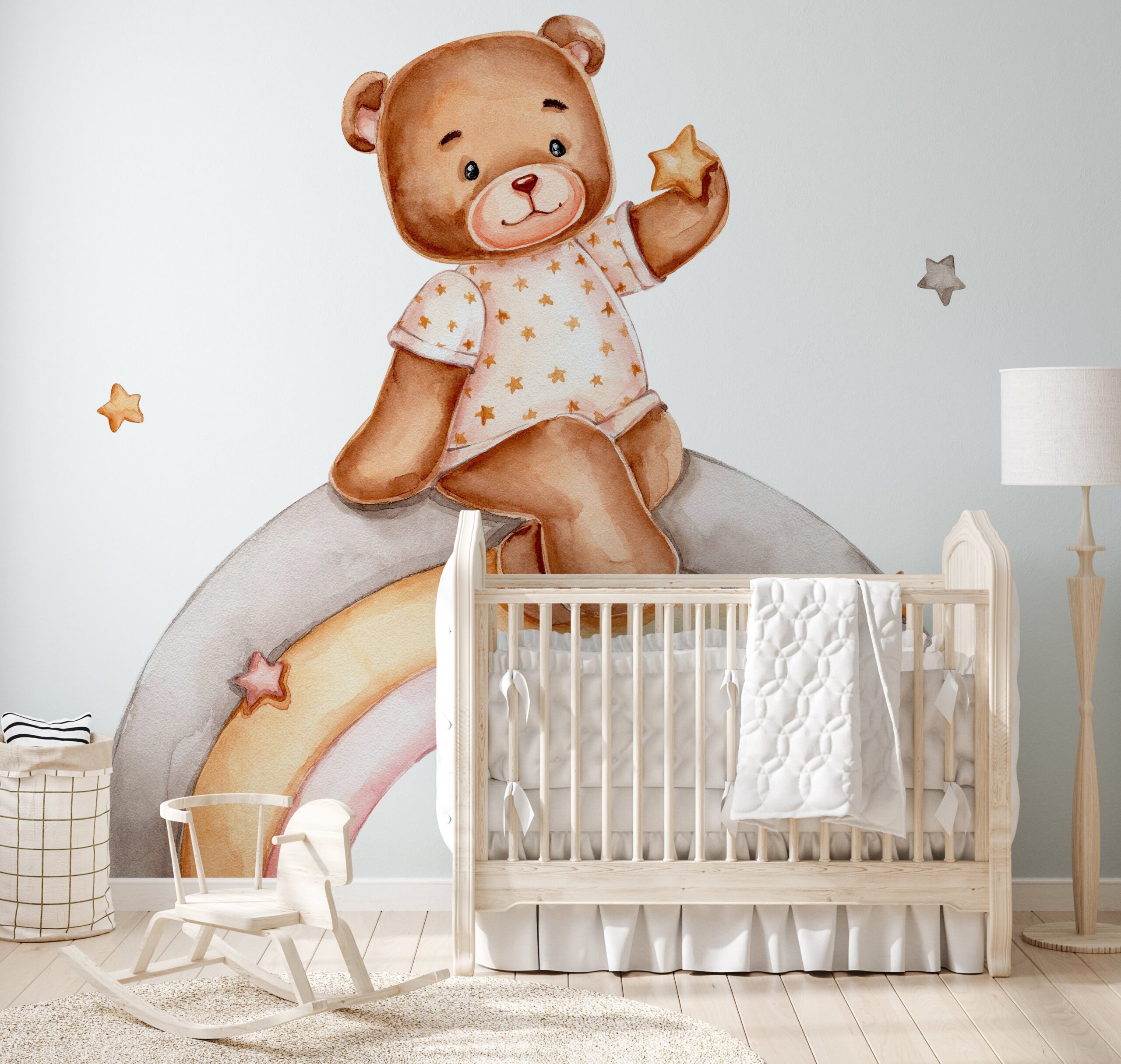 Sillni pak magji dhe gëzim në shtëpinë tuaj me Sfondin Fotografik “Bota e Arushëve të Pelushit me Ylber”. Ky model simpatik dhe shumëngjyrësh përshkruan një arush pelushi në një udhëtim nëpër një ylber të magjepsur, duke ndriçuar hapësirën me ngrohtësi dhe optimizëm. Retë shumëngjyrëshe, yjet dhe ylberët krijojnë një atmosferë përrallore, perfekte për dhomën e një fëmije.