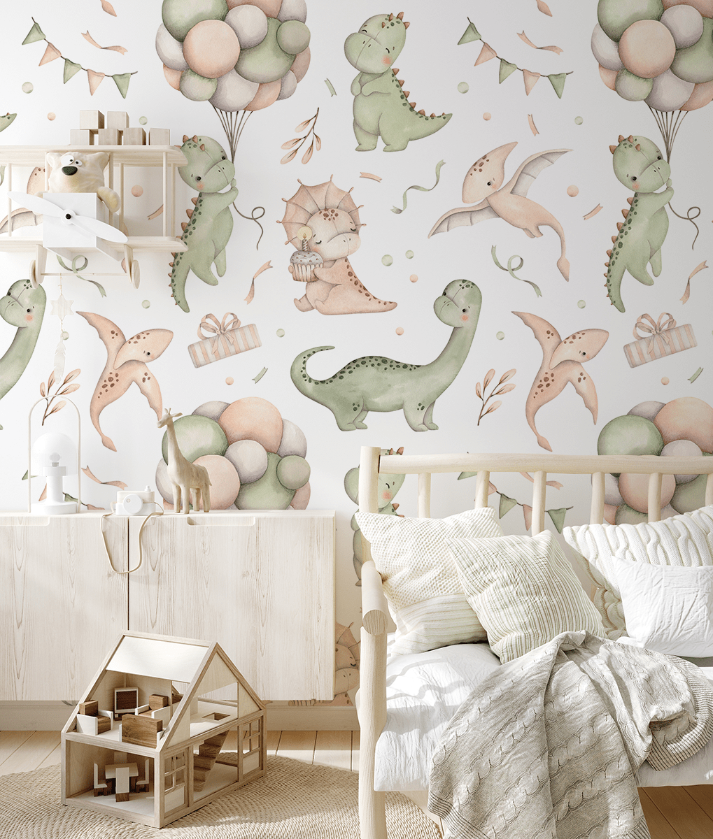 Hyni në një atmosferë unike plot buzëqeshje dhe magji në dhomën e fëmijës suaj me Letrën e Murit me Foto “Dinosaurët në një Festë”. Ky kompozim shumëngjyrësh dhe simpatik përshkruan dinosaurë pastel që luajnë midis tullumbaceve dhe luleve, duke krijuar një atmosferë të gëzueshme dhe miqësore që do të kënaqë çdo fëmijë. Ngjyrat delikate dhe format e këndshme do të jenë perfekte për hapësirën e fëmijës, duke frymëzuar imagjinatën dhe duke inkurajuar lojën.