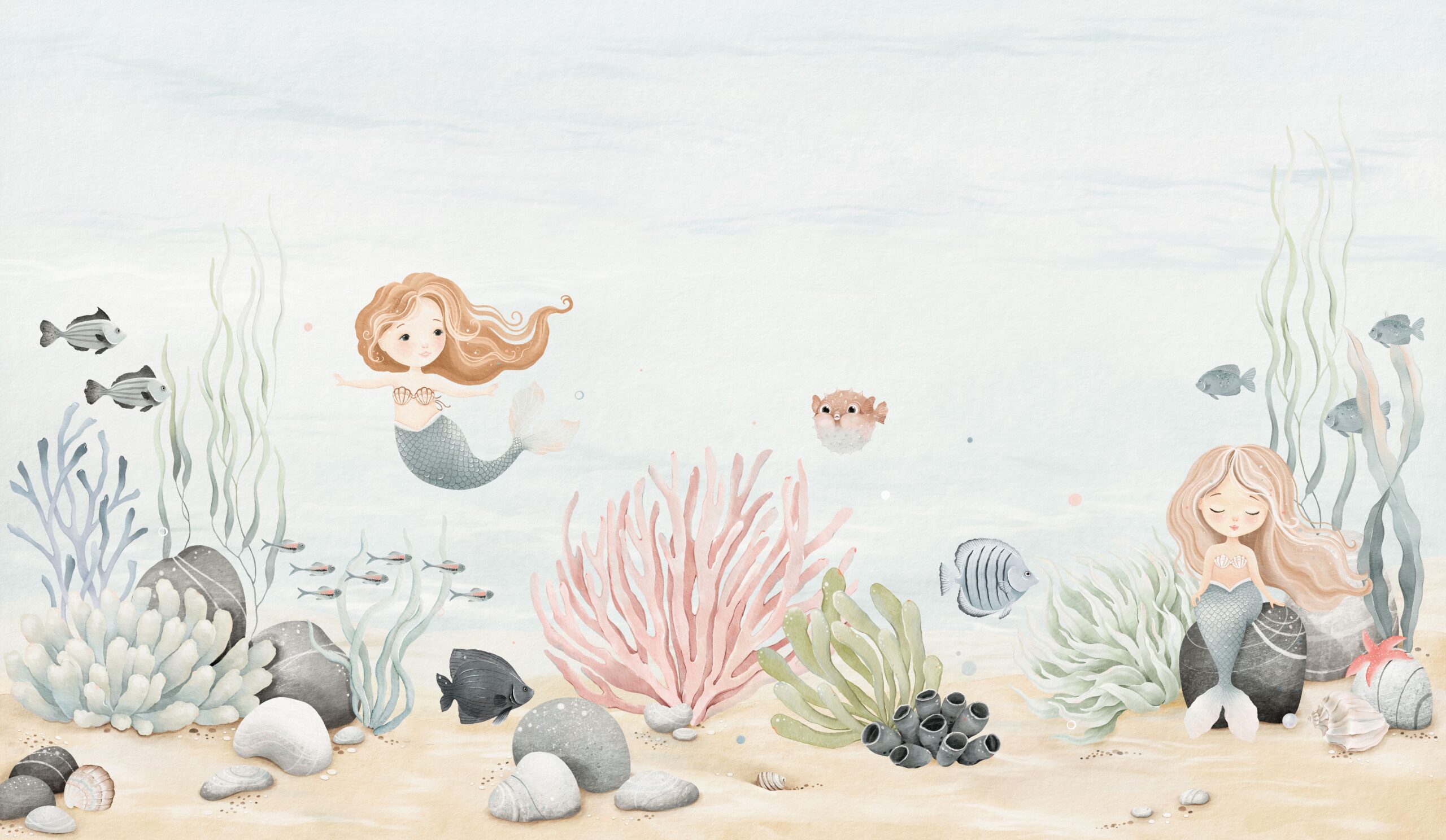 Zhytuni në një botë të jashtëzakonshme me letrën muri me foto “Ëndrrat nënujore të sirenave”. Ky motiv simpatik pastel me sirena, peshq dhe bimë deti do ta transportojë fëmijën tuaj në një botë të magjepsur nënujore plot aventura dhe imagjinatë. Ngjyrat delikate dhe format e buta do të përshtaten në mënyrë të përkryer në dhomat e fëmijëve, duke krijuar një atmosferë paqeje dhe gëzimi.