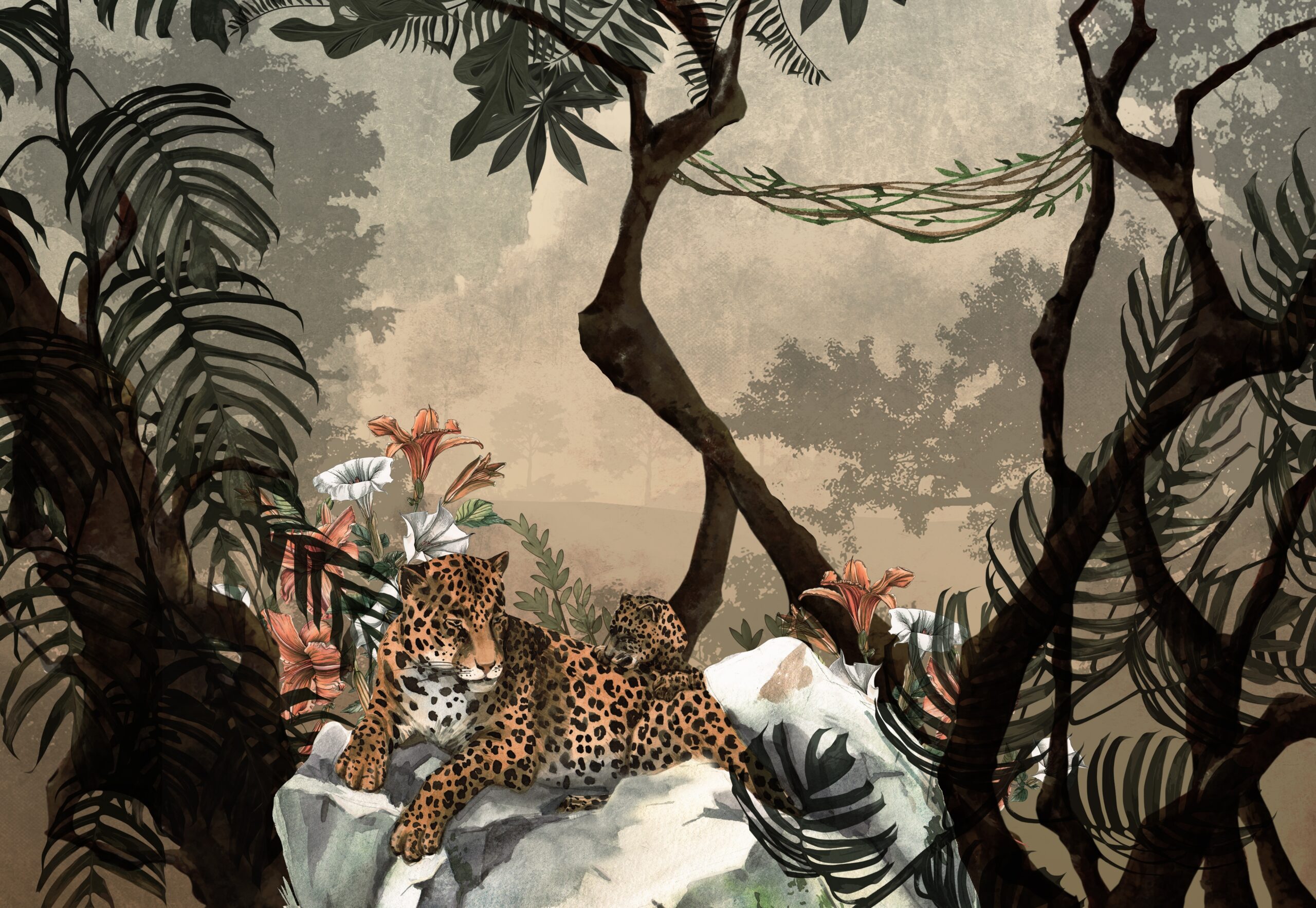- 3D, Foto murale, GJETHE TROPIKALE, Ngjyrat, Nuancat e gjelbërim, Nuancat e gri, Për dhoma, PËR DHOMA GJUMI, PËR SALLONE, Stili, Tropikale