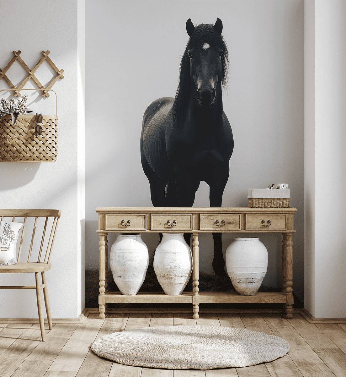 Prezantojeni një atmosferë unike në ambientin tuaj të brendshëm me sfondin fotografik “Kali i Zi”. Ky kompozim prekës dhe i thellë tregon fuqinë dhe bukurinë e një kali që qëndron në një sfond mjegulle delikate, duke krijuar një imazh plot paqe dhe natyrë të egër. Kombinimi kontrastues i një siluete të errët në një sfond të çelët tërheq syrin dhe i sjell një prekje misteri dhe elegance dhomës.