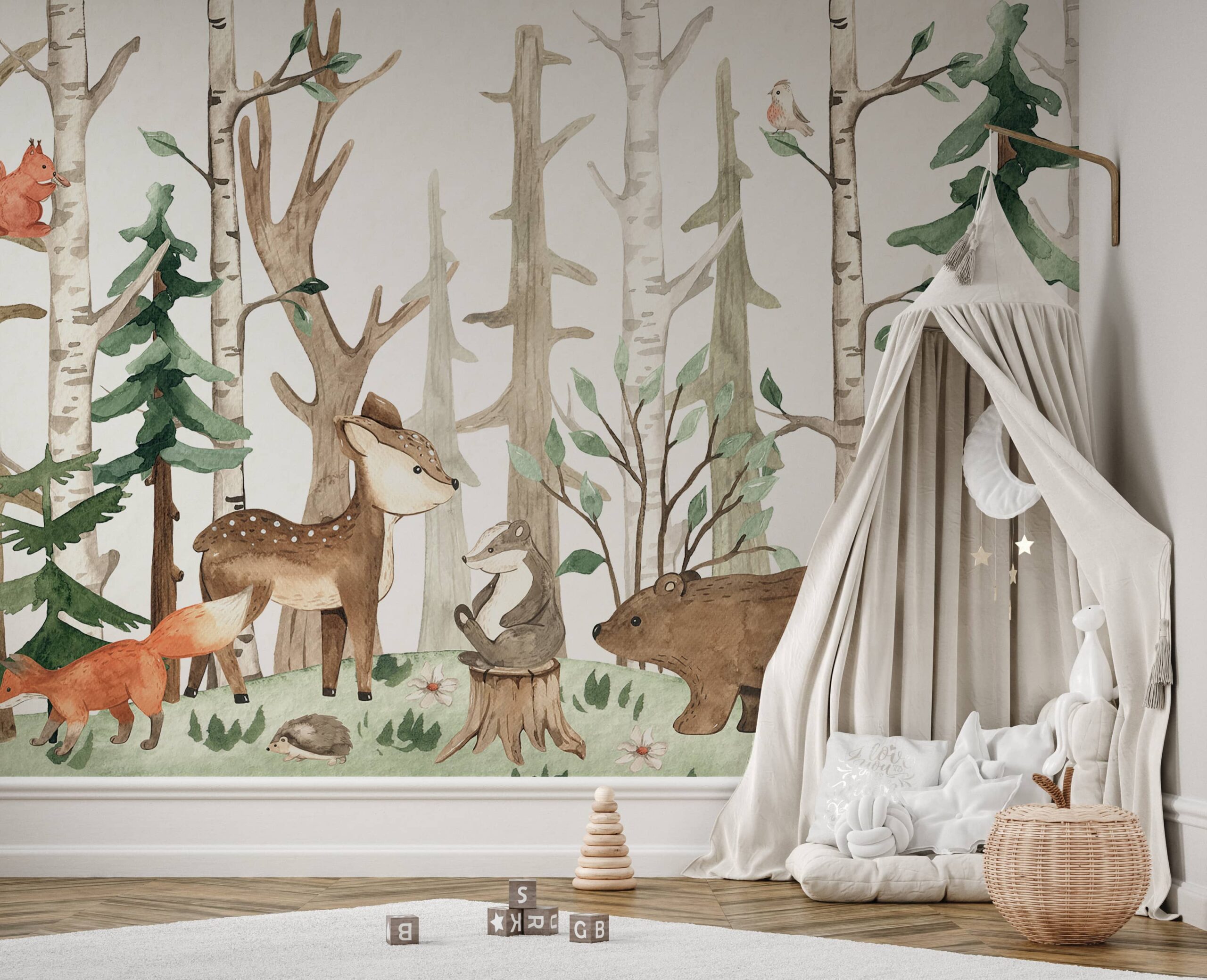 Transportoni fëmijën tuaj në botën magjike të pyllit me muralin “Forest Pack”. Ky model unik me bojëra uji përshkruan një pyll të qetë plot me kafshë miqësore – nga ketrat, dhelprat, drerët, iriqët, te arinjtë dhe një lepur. Ngjyrat delikate, linjat e buta dhe personazhet miqësorë krijojnë një atmosferë të ngrohtë dhe komode, të favorshme për qetësi dhe zhvillimin e imagjinatës.