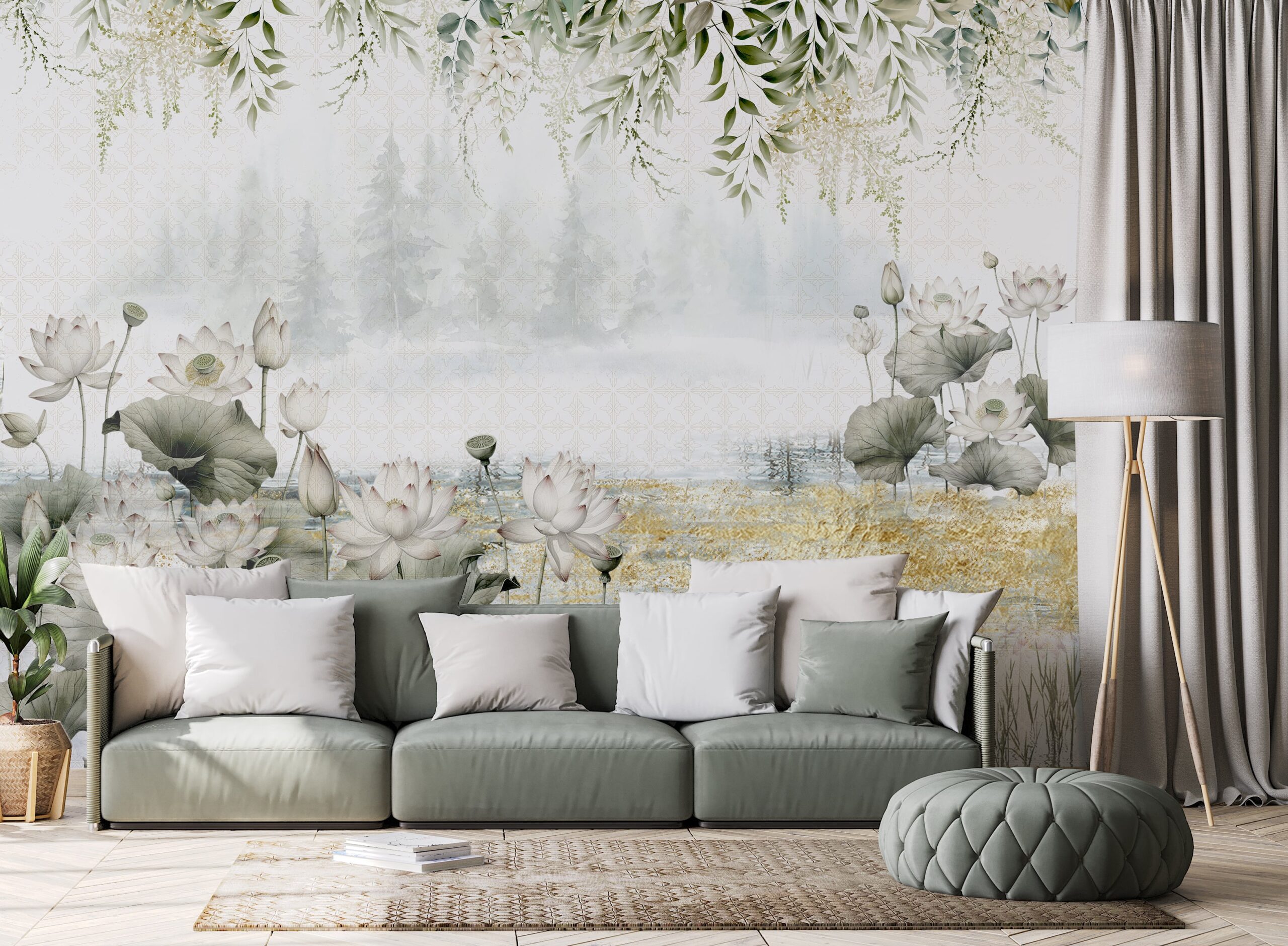 Sillni një atmosferë unike në shtëpinë tuaj me sfondin fotografik “Lotus Pond”. Ky model delikat, i frymëzuar nga natyra, përshkruan një liqen të qetë me lotusë që lulëzojnë dhe një sfond të butë mjegulle, duke krijuar një atmosferë ngushëllimi dhe sofistikimi. Ngjyrat e ndritshme dhe të zbehta dhe detajet e sofistikuara përshtaten në mënyrë të përkryer si në aranzhimet moderne ashtu edhe në ato klasike.