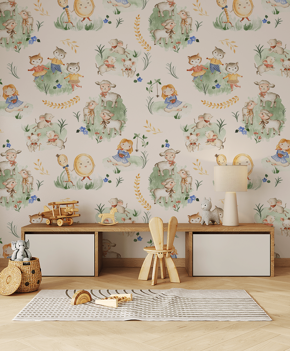 Shndërrojeni dhomën e fëmijës suaj në një vend magjik me sfondin fotografik “Livadh përrallor për fëmijë të vegjël”. Ky model i pikturuar me dorë, plot me kafshë të lezetshme, personazhe të gëzuar dhe ngjyra të buta, i transporton më të vegjlit në botën e përrallave dhe ninullave klasike. Motive të frymëzuara nga rima – siç janë kotelet, qengjat dhe minjtë që kërcejnë – krijojnë një atmosferë pakujdesie, gëzimi dhe ngrohtësie.