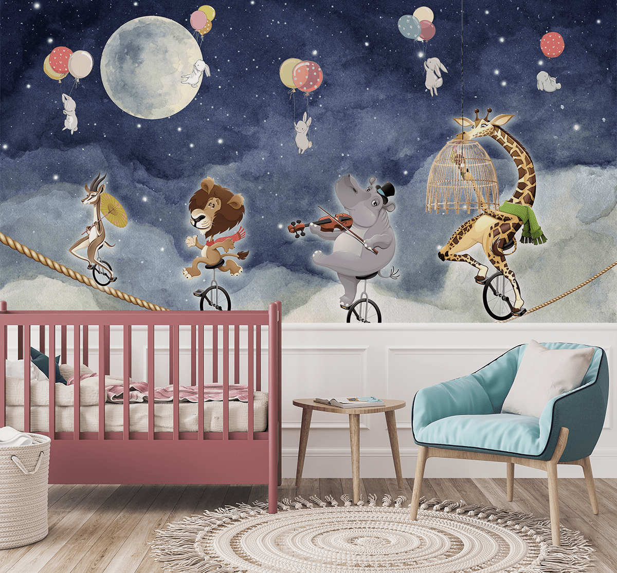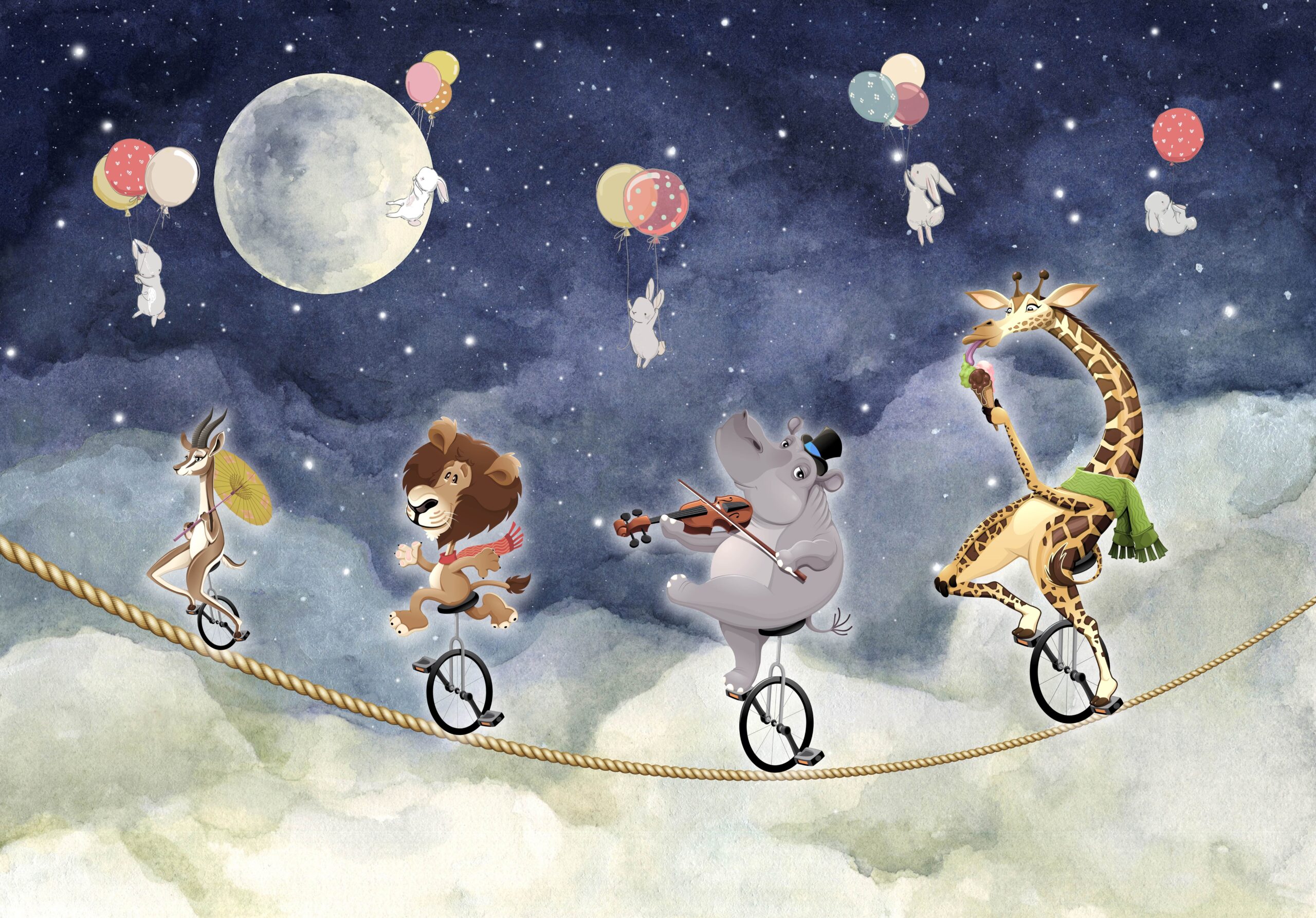 Zhytuni në botën magjike të ëndrrave me muralin “Nata e Cirkut Mbi Re”. Ky motiv simpatik dhe shumëngjyrësh përshkruan një paradë të gëzueshme kafshësh cirku që balancojnë në një litar të tendosur mbi retë – midis yjeve, tullumbaceve dhe një hëne të ndritshme. Lepuj që kërcejnë, një gjirafë që ha akullore ose një hipopotam që luan violinë – çdo detaj është një ftesë për të luajtur dhe për të zhvilluar imagjinatën e një fëmije.