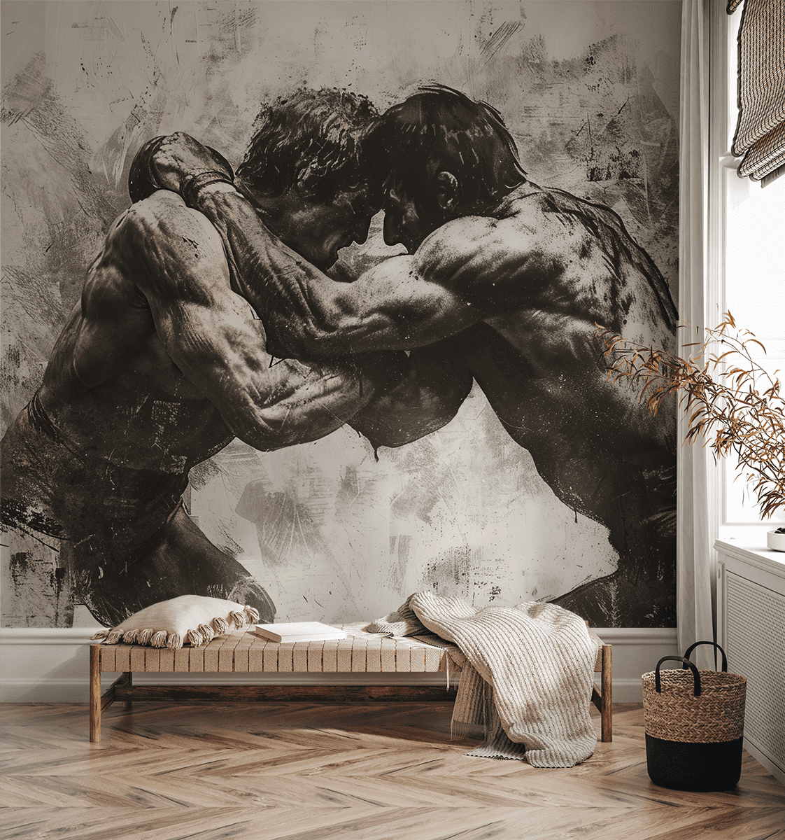 Sillni një atmosferë unike në shtëpinë tuaj me sfondin fotografik “Në Përqafimin e Luftës”. Ky motiv prekës bardh e zi përshkruan dy mundës në një përleshje intensive, duke nxjerrë forcë, vendosmëri dhe pasion. Kompozimi ekspresiv, i frymëzuar nga skicat klasike sportive, thekson fuqinë e trupit të njeriut dhe shpirtin luftarak, duke krijuar një theks unik në çdo hapësirë.