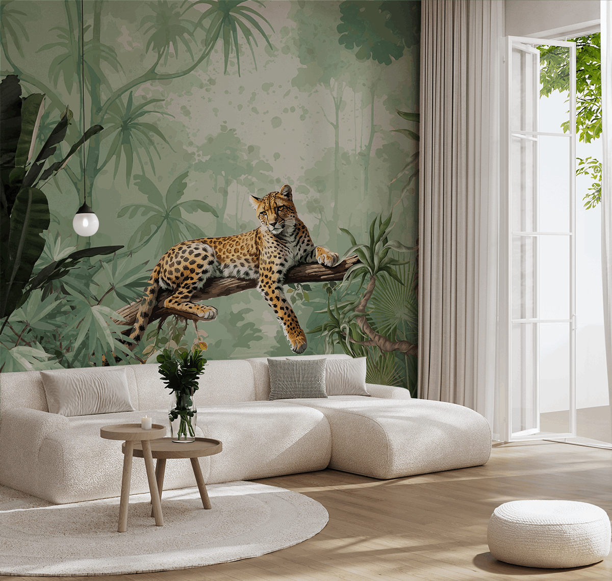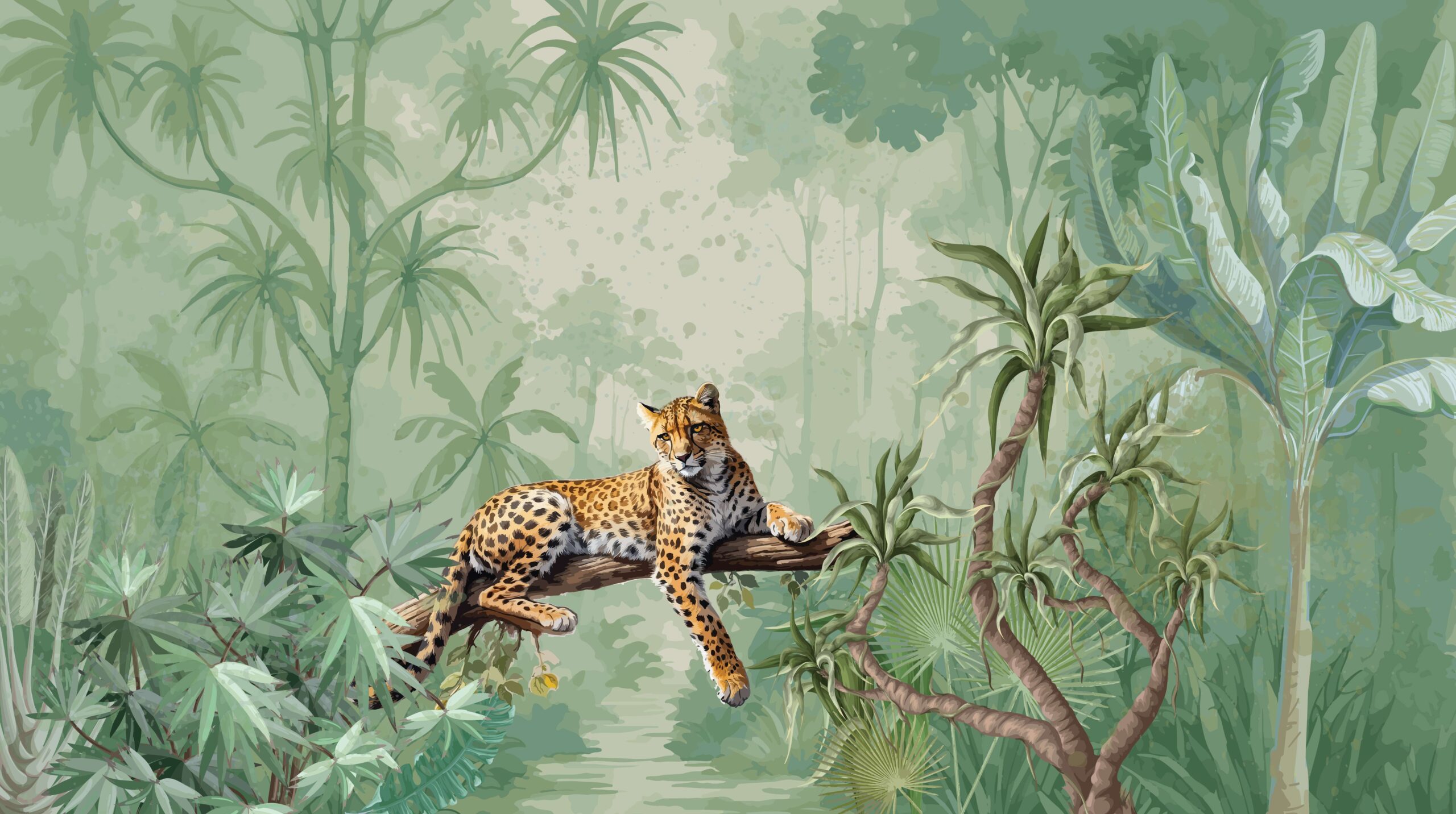 Zbuloni sharmin e jashtëzakonshëm të natyrës me sfondin fotografik “Qetësia në Xhungël”, i cili ju transporton në botën e bimëve ekzotike dhe jetës së egër. Pika qendrore e kompozimit është një leopard madhështor që pushon mbi një degë, i rrethuar nga gjelbërim i harlisur tropikal. Ky motiv piktural dhe i punuar me kujdes krijon një atmosferë paqeje, ekuilibri dhe elegance paksa të egër.