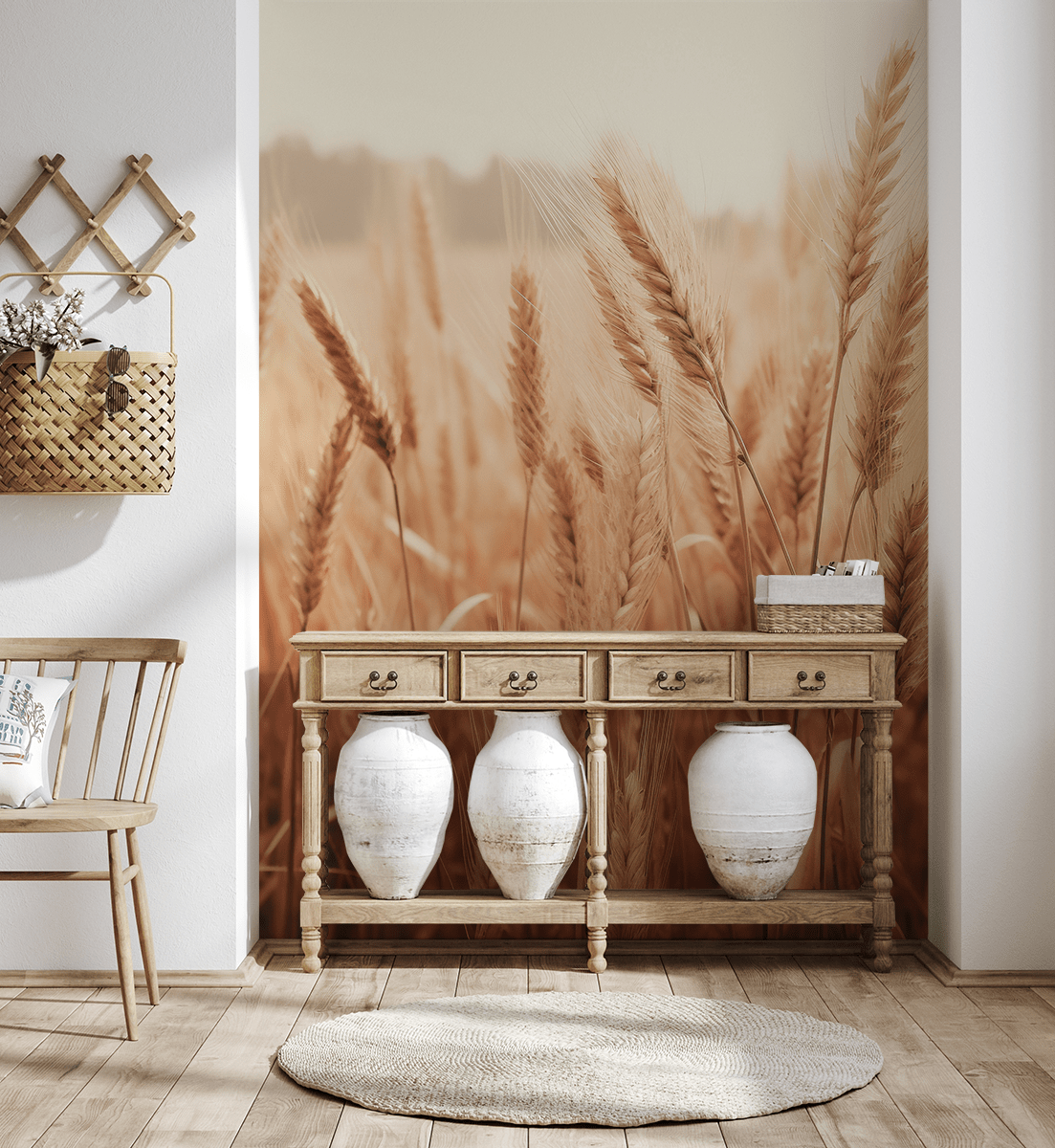Sillni një atmosferë unike në shtëpinë tuaj me letër muri me foto “Pëshpëritja e Vjeshtës së Drithërave”. Ky motiv delikat, i artë me kallinj drithërash sjell në mendje qetësinë e një fushe vjeshte, duke krijuar një atmosferë me dritë dhe ngrohtësi natyrore. Detajet delikate dhe ngjyrat e zbehta harmonizohen në mënyrë të përkryer si me aranzhimet moderne ashtu edhe me ato klasike.