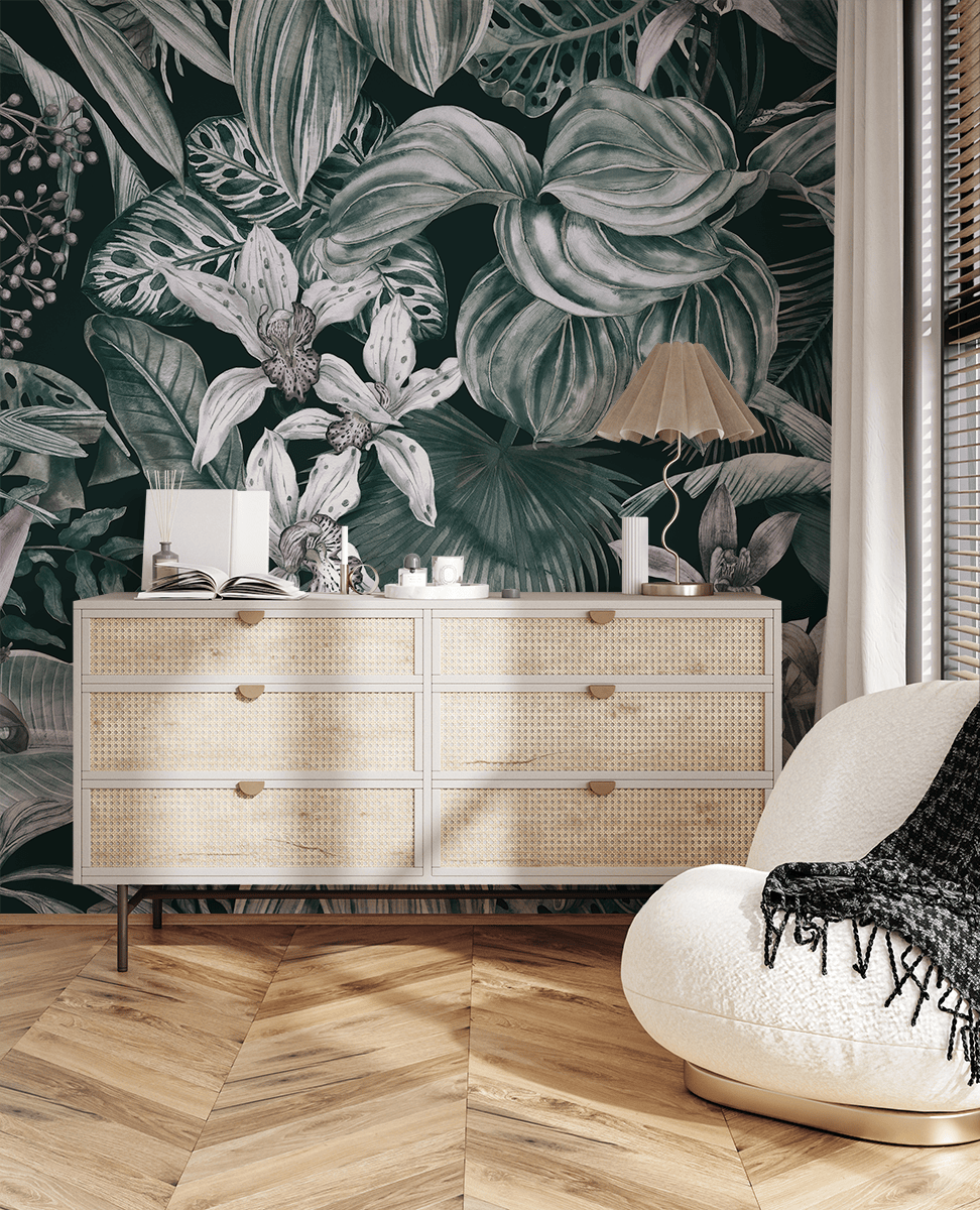 Zhytuni në botën e jashtëzakonshme të bimësisë tropikale me letër sfondi fotografik “Pëshpëritje tropikale”. Ky model i sofistikuar, në një paletë të zbutur ngjyrash jeshile dhe vjollce, sjell atmosferën e një xhungle të dendur në brendësinë tuaj – plot me gjethe të harlisura, lule ekzotike dhe detaje delikate. Ky është një propozim për ata që duan të krijojnë një hapësirë të mbushur me natyrë, por delikate dhe elegante në të njëjtën kohë.