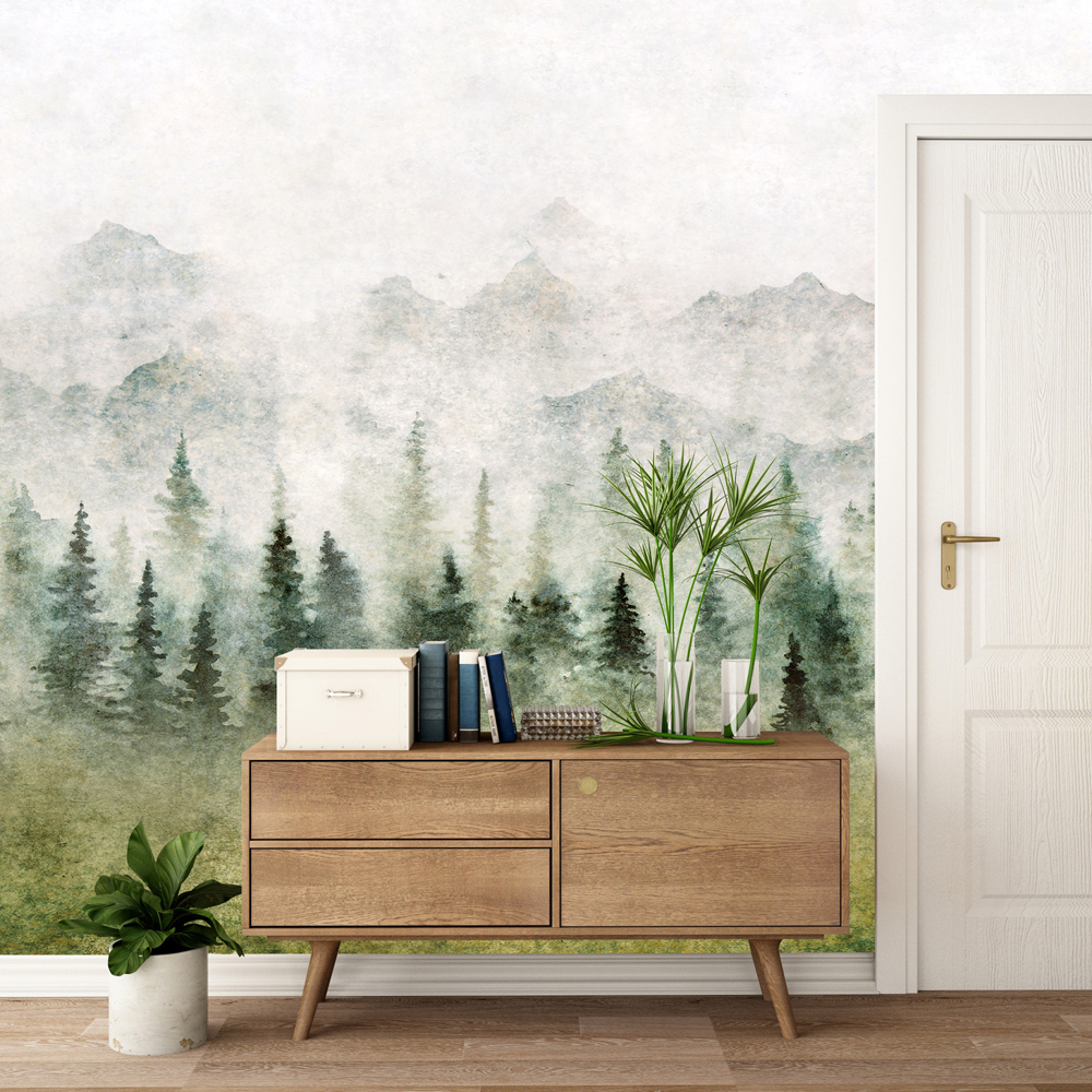 Peizazhi i paraqitur tregon një pyll të dendur halorë, majat e pemëve të të cilit zhduken gradualisht në një mjegull të lehtë, ndërsa në sfond shfaqen silueta malore paqësore. Paleta natyrale e ngjyrave të gjelbra, gri dhe bezhë e bën këtë pikturë me bojëra uji të një pylli në mjegull të përshtatet në mënyrë të përkryer me trendet aktuale të dizajnit të brendshëm të frymëzuara nga natyra, stilet skandinave, japoneze dhe boho.
