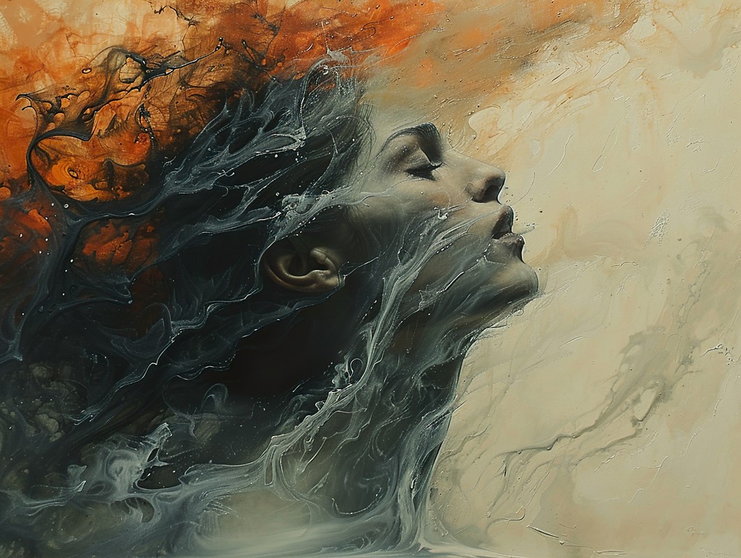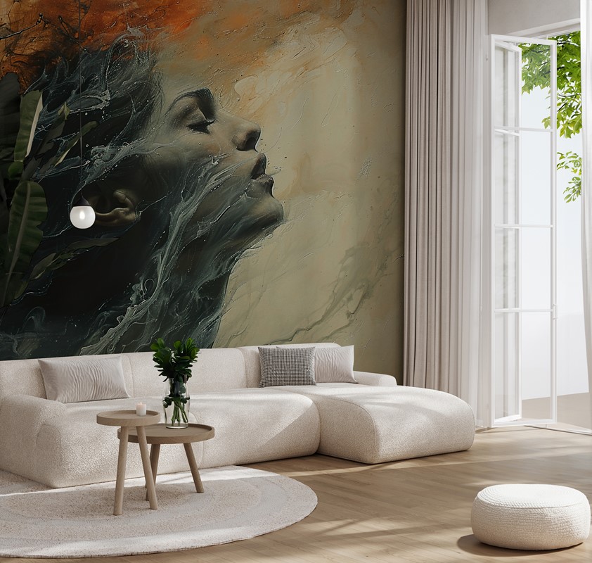 Futni një prekje arti dhe emocioni në hapësirën tuaj me muralin “Portret Femëror në Abstraksion”. Ky kombinim i jashtëzakonshëm i një portreti realist me një abstraksion fluid, pothuajse piktorik, krijon një efekt thellësie, lëvizjeje dhe force të brendshme. Tiparet delikate të fytyrës së një gruaje, të zhytura në struktura të valëzuara tymi dhe ngjyre, krijojnë një kompozim plot harmoni dhe estetikë të rafinuar.