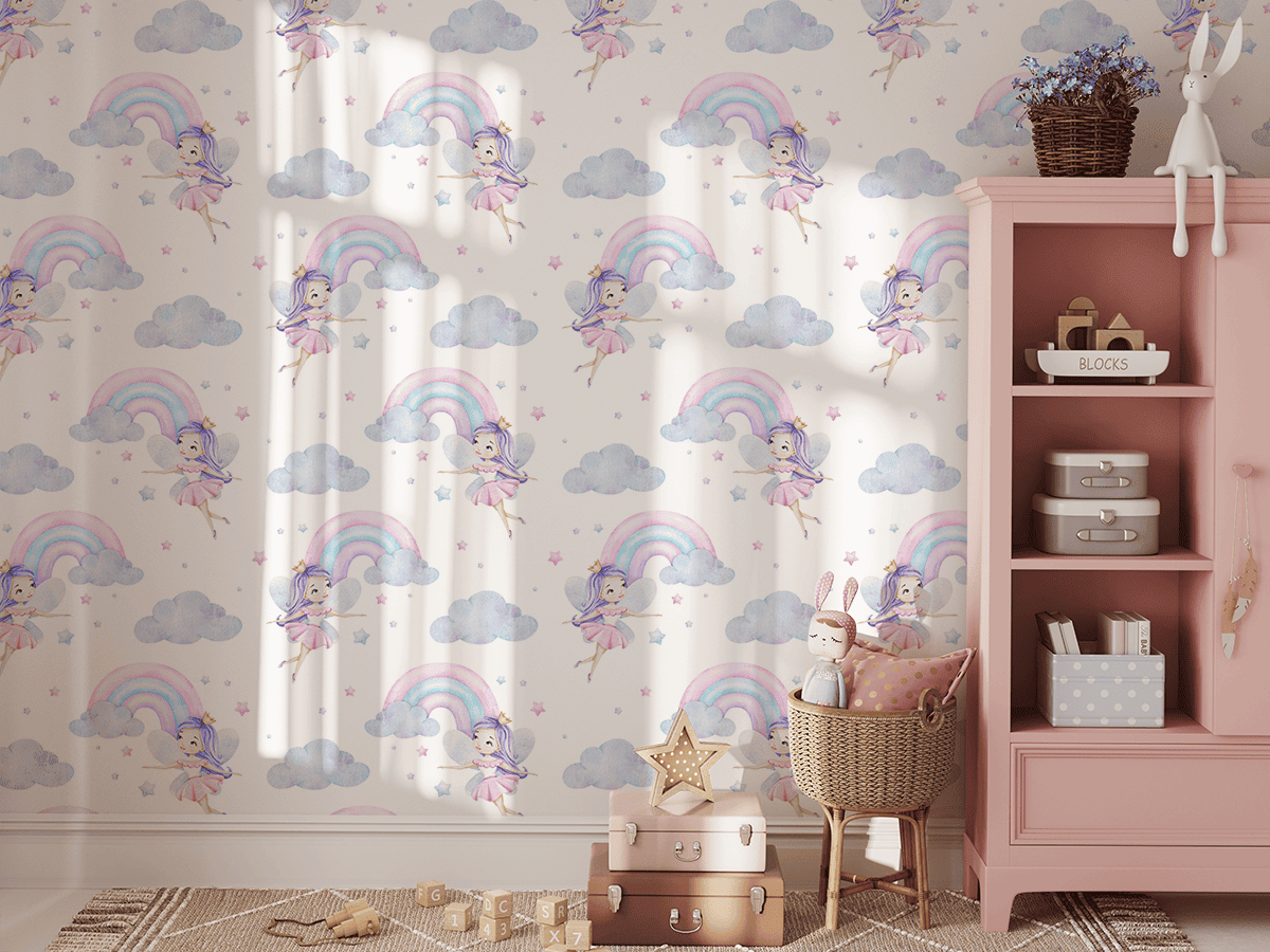 Prezantojeni një atmosferë unike dhe simpatike në dhomën e fëmijës suaj me letër muri “Princesha e Reve”. Ky model delikat me ylberë pastel, re dhe zana të adhurueshme me fustane rozë krijon një atmosferë plot ngrohtësi, magji dhe gëzim fëmijëror. Perfekte për një dhomë gjumi ose dhomë lojërash, ku imagjinata dhe ëndrrat mund të lulëzojnë çdo ditë.