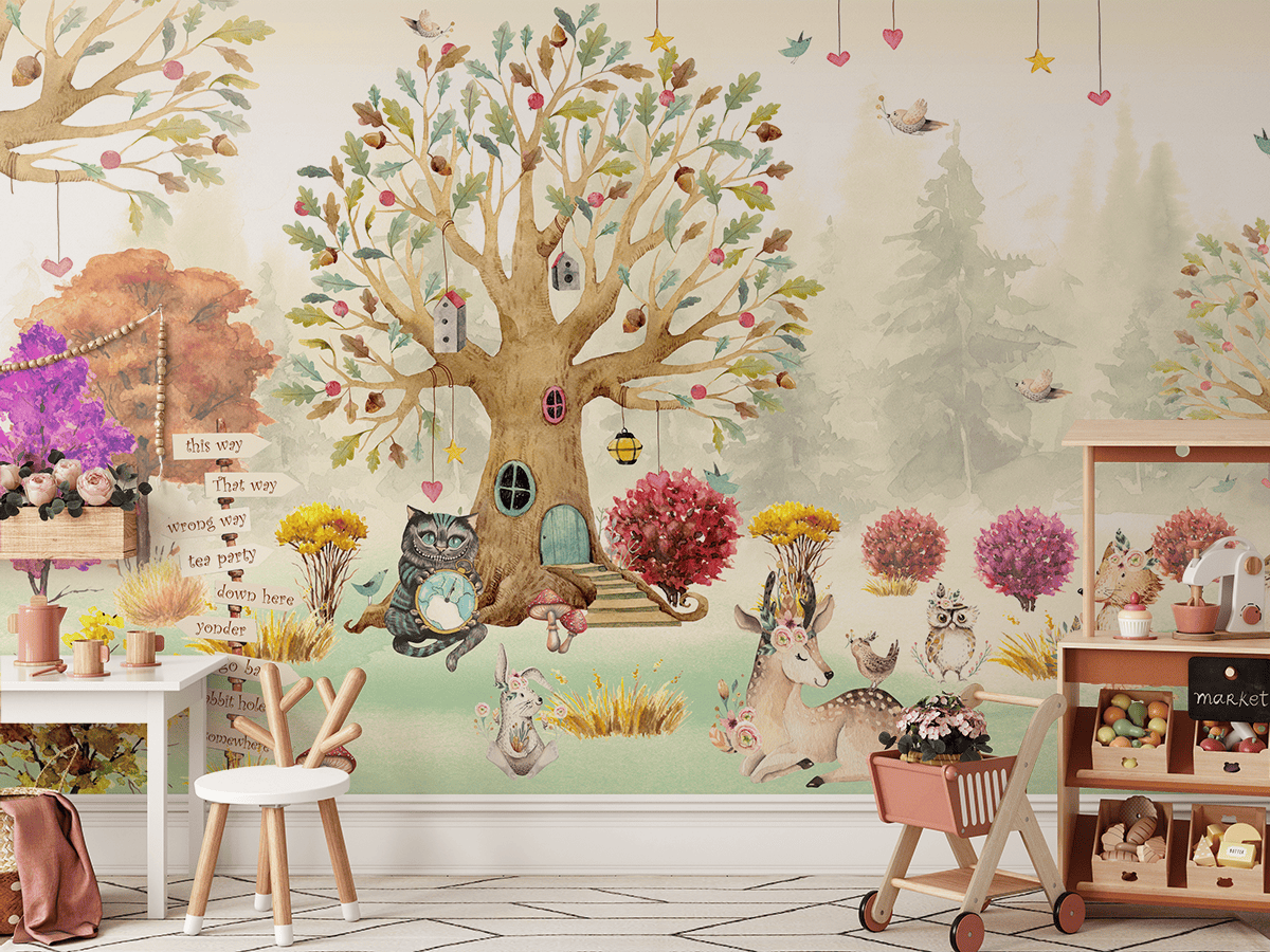 Ngjyrat delikate pastel, personazhet simpatikë dhe një atmosferë përrallore e bëjnë këtë mural ideal për dhomën e një fëmije të vogël, dhomën e një parashkollori ose këndin e lojërave. Është një dekorim që zhvillon imagjinatën, qetëson shqisat dhe krijon një hapësirë komode plot ngrohtësi dhe fantazi.