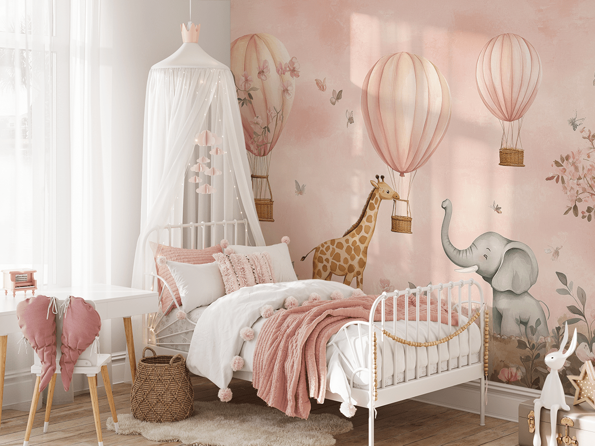 Hyni në një atmosferë përrallore në dhomën e fëmijës suaj me sfondin me foto “Balloon Safari”. Ky ilustrim simpatik pastel përshkruan një elefant dhe një gjirafë miqësore të rrethuar nga lule dhe tullumbace që fluturojnë në një qiell delikat rozë. Ngjyrat e ngrohta dhe personazhet miqësorë do të krijojnë një hapësirë plot ngrohtësi, fantazi dhe gëzim fëmijëror.
