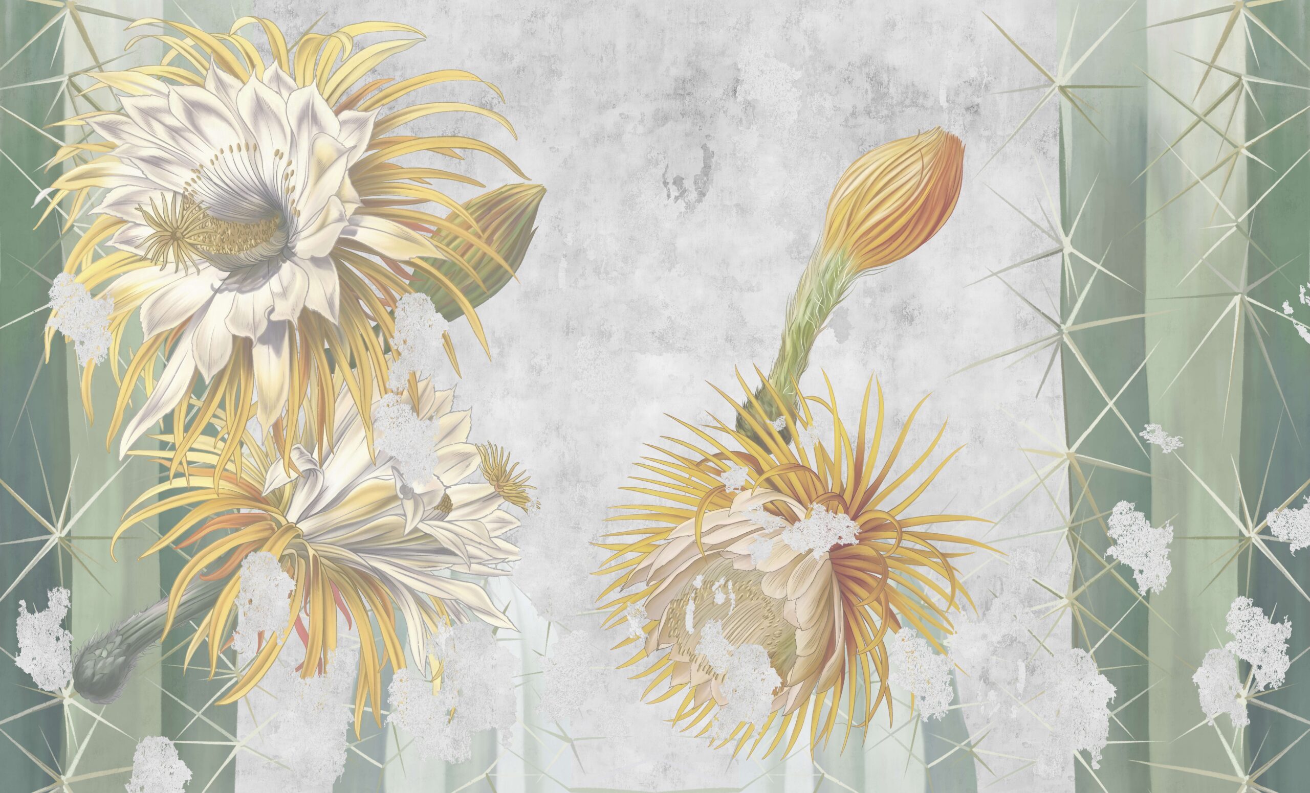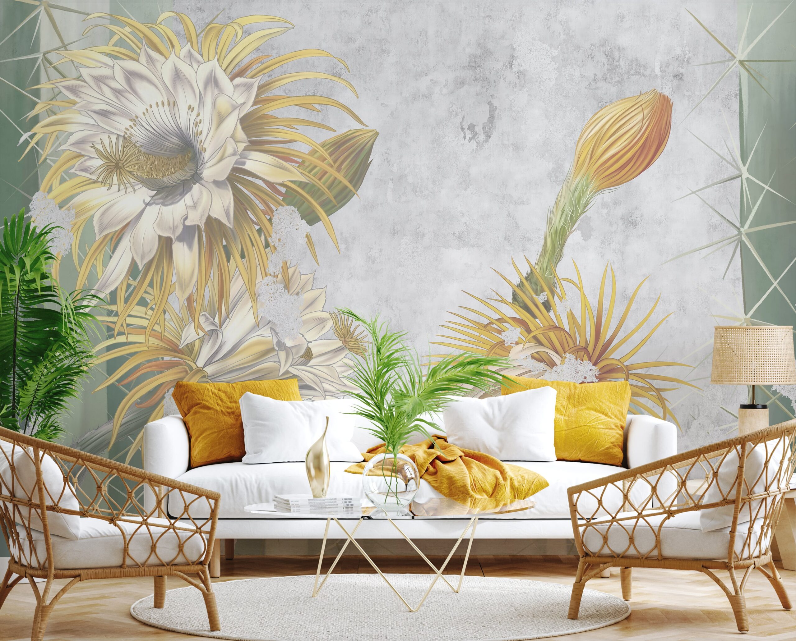 Prezantoni një atmosferë paqeje dhe bukurie ekzotike në ambientet tuaja të brendshme me pikturën murale “Shkëlqimi i Shkretëtirës”. Ky model unik përshkruan kaktusët që lulëzojnë në një interpretim delikat artistik, duke kombinuar thekse të arta, detaje delikate dhe ngjyra të zbehta të sfondit. Kompozimi, i frymëzuar nga një peizazh shkretëtire, i shton hapësirës lehtësi dhe një karakter të sofistikuar.