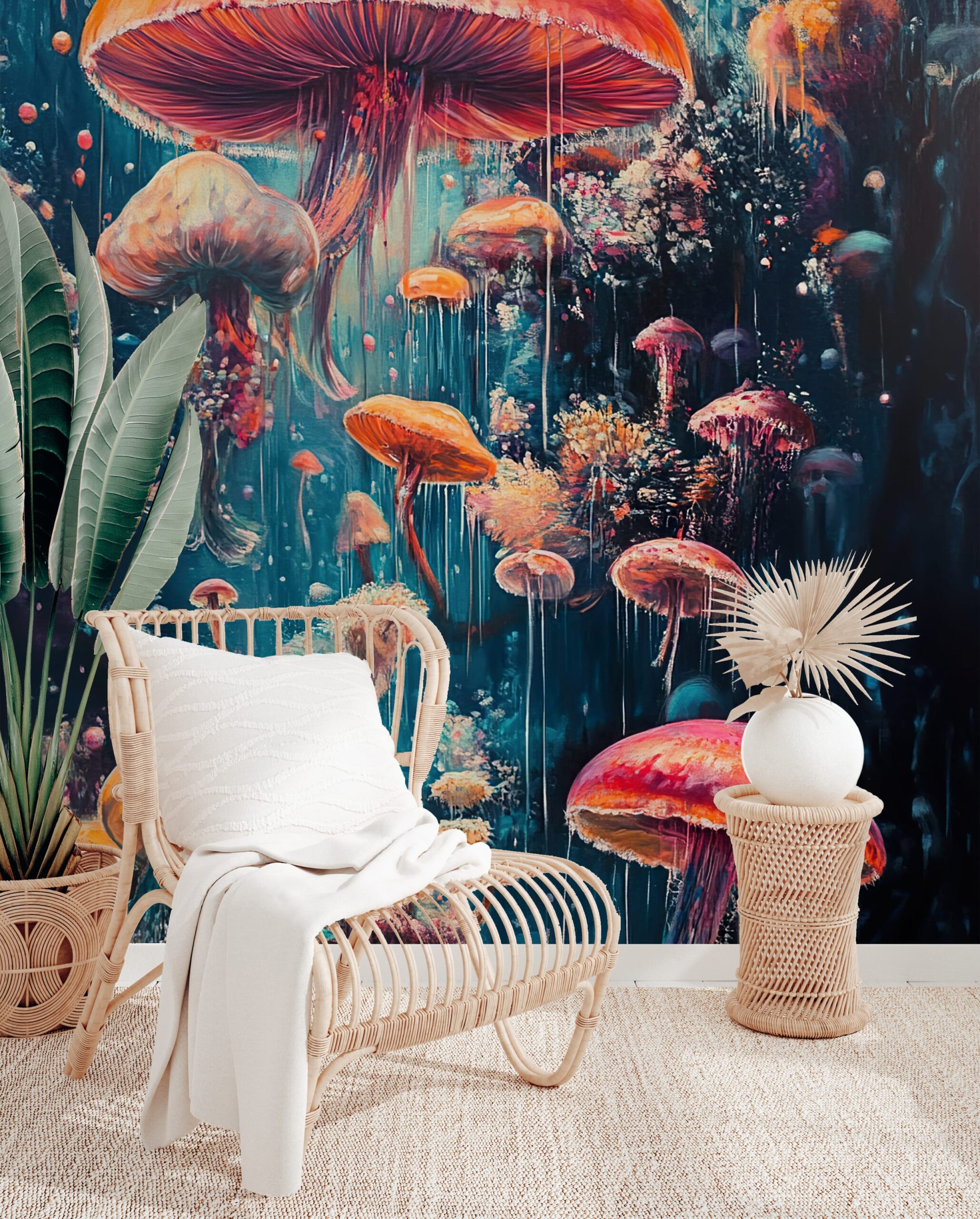 Sillni një atmosferë unike në shtëpinë tuaj me letër muri me foto “Shkëlqim kërpudhash”. Ky model magjepsës dhe shumëngjyrësh, i frymëzuar nga bota sureale e kërpudhave, nxjerr një dritë delikate dhe shkëlqim misterioz që do të transformojë çdo hapësirë, duke i dhënë asaj një karakter unik dhe artistik. Ngjyrat intensive dhe format dinamike plotësojnë në mënyrë të përkryer dizajnet moderne dhe eklektike të brendshme.