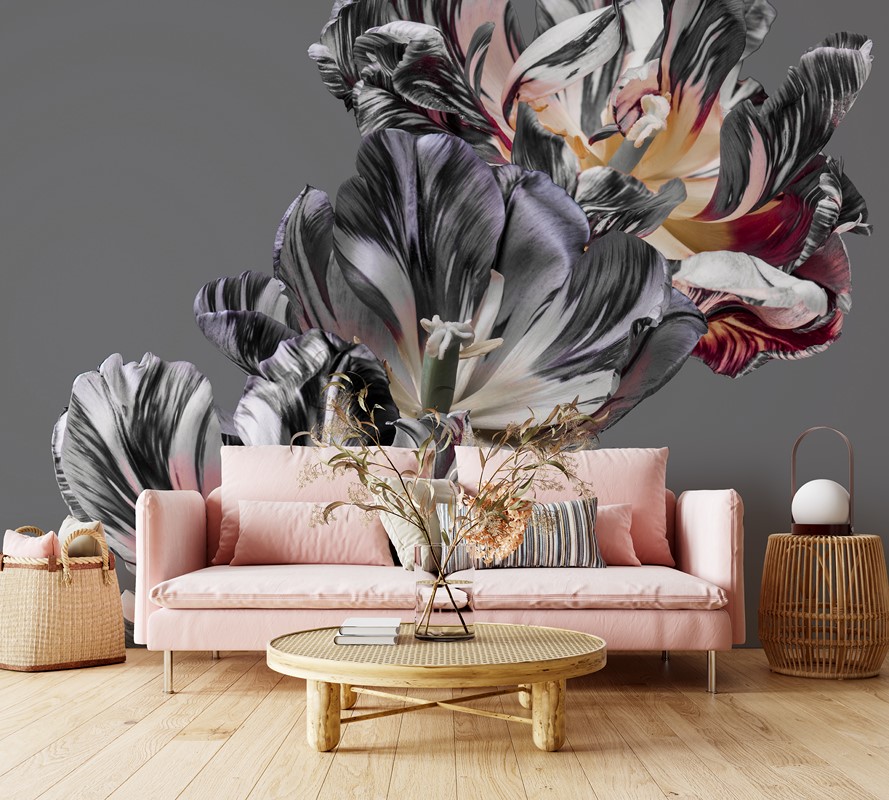 Dekorim elegant muri – një motiv dinamik lulesh i shton karakter dhe energji hapësirës.