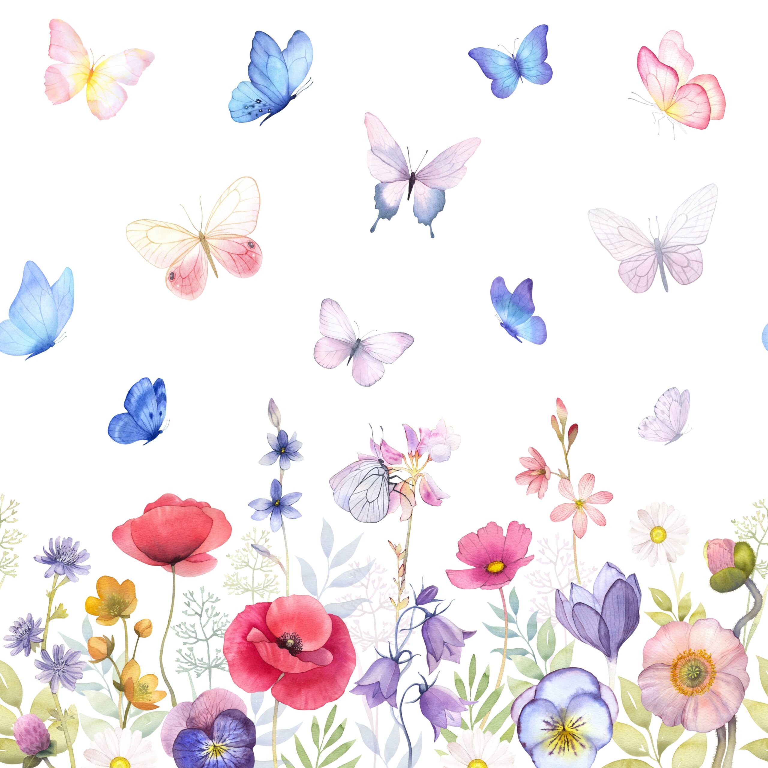 Sfondi fotografik “Simfonia e Pranverës” – një hapësirë e gëzueshme dhe plot ngjyra plot flutura dhe lule, e cila sjell magjinë dhe freskinë e një fëmije në dhomë.