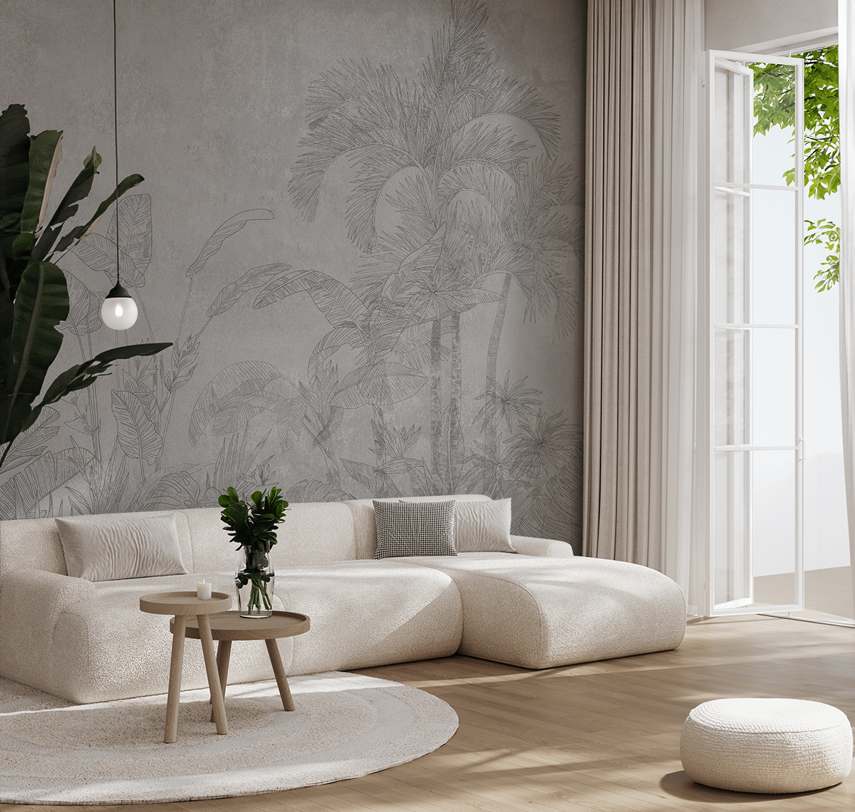 Paleta gri e zbutur dhe detajet e bimëve të riprodhuara me saktësi i japin hapësirës një lehtësi, pa dominuar, por duke plotësuar në mënyrë harmonike çdo rregullim – si modern ashtu edhe më klasik.
