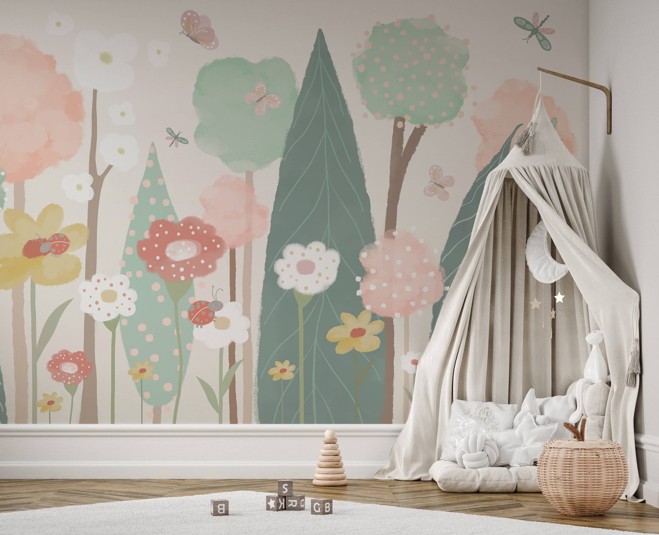 Shndërrojeni dhomën e fëmijës suaj në një hapësirë magjike plot buzëqeshje me sfondin fotografik “Toka e Luleve”. Ky model simpatik pastel i transporton më të vegjlit në një kopsht përrallor plot lule shumëngjyrëshe, flutura të gëzuara, mollëkuqe të adhurueshme dhe pemë të çuditshme. Ngjyrat delikate dhe format miqësore krijojnë një atmosferë ngrohtësie, sigurie dhe loje të gëzueshme.