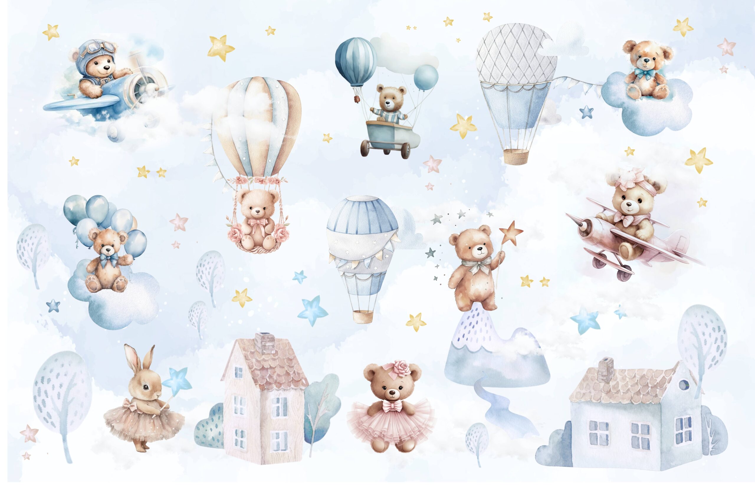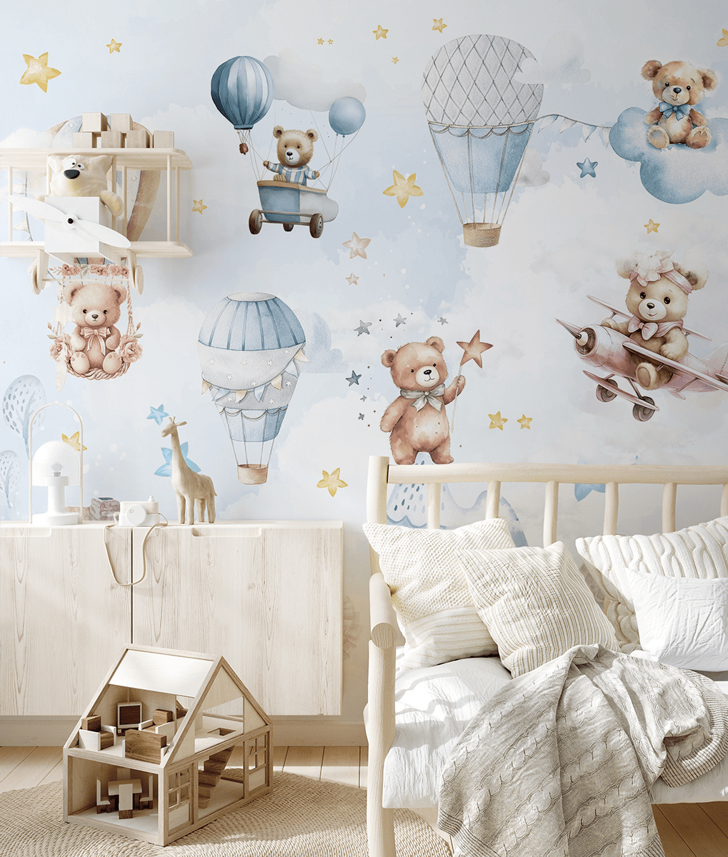 Hyni në një atmosferë unike në dhomën e fëmijës suaj me muralin “Teddy Bear’s Starland”. Ky model delikat pastel përshkruan arushë pelushi të adhurueshëm që fluturojnë mbi tullumbace, re dhe aeroplanë të rrethuar nga yje, duke krijuar një botë plot ngrohtësi dhe fantazi. Ngjyrat delikate dhe detajet e buta do të përshtaten në mënyrë të përkryer në dhomën e një foshnje dhe të një fëmije më të madh, duke zhvilluar imagjinatën e tyre dhe duke ofruar një hapësirë komode për lojë dhe relaksim.