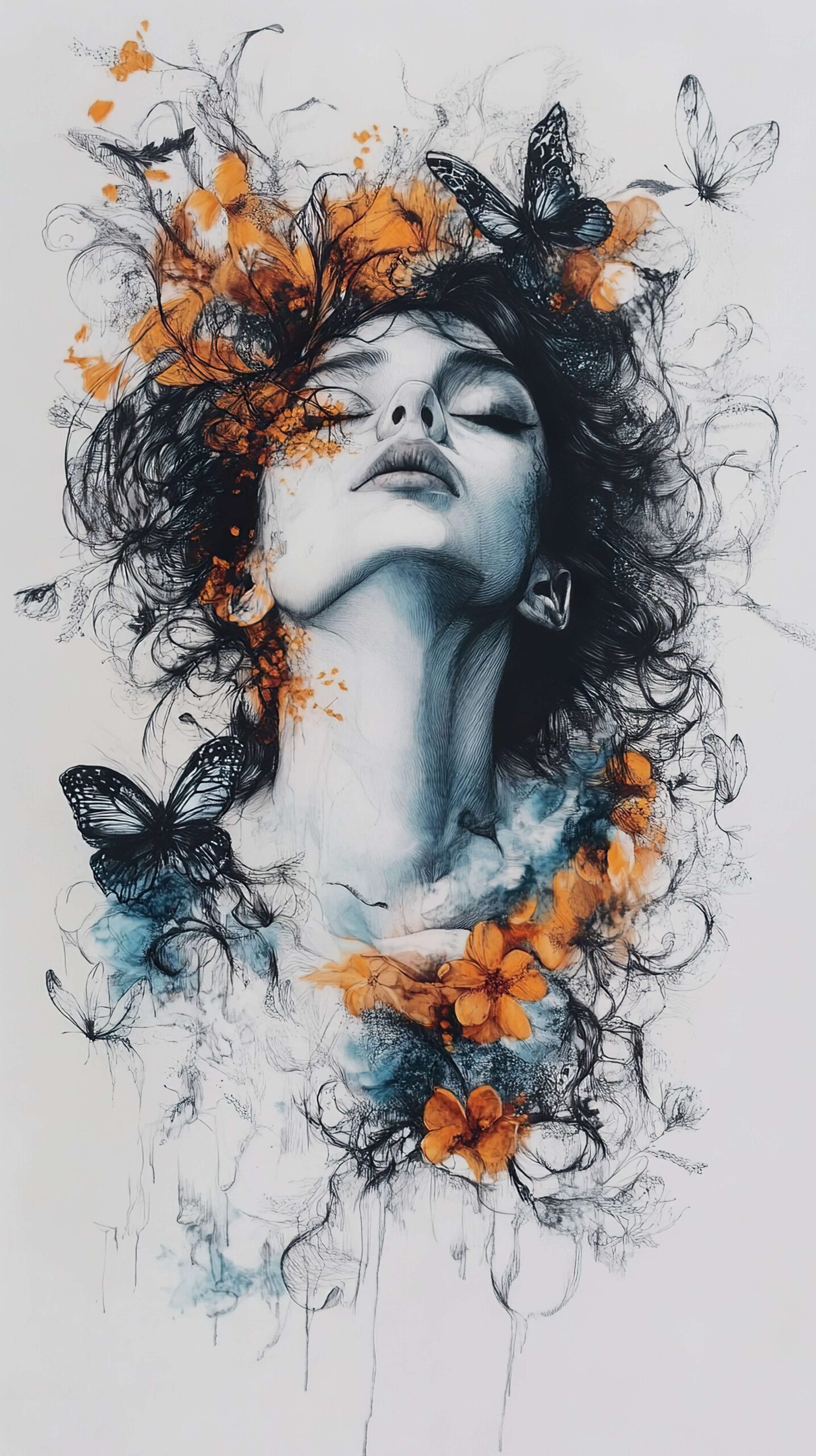 Futni një atmosferë unike në ambientin tuaj të brendshëm me këtë mural. Ky portret artistik prekës i një gruaje të rrethuar nga flutura dhe lule kombinon një skicë dinamike me spërkatje ngjyrash, duke krijuar një kompozim plot emocion, lëvizje dhe lehtësi. Kombinimi i ngjyrave kontrastuese – e zeza, portokallia dhe bluja – i jep hapësirës ekspresivitet dhe thellësi.