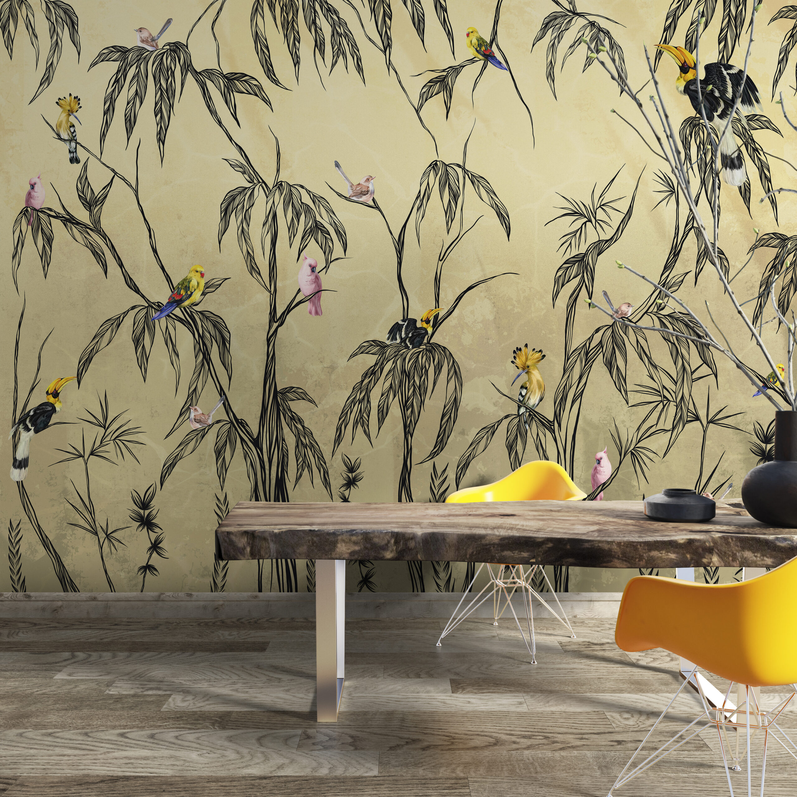Grafikat e shkëlqyera dhe ngjyrat intensive e bëjnë sfondin me foto Zogj Shumëngjyrësh një plotësues të përsosur si për dizajnet moderne ashtu edhe për ato klasike të brendshme. Duke e shtuar atë në shtëpinë tuaj, do të krijoni një atmosferë harmonike plot ngrohtësi dhe rehati.